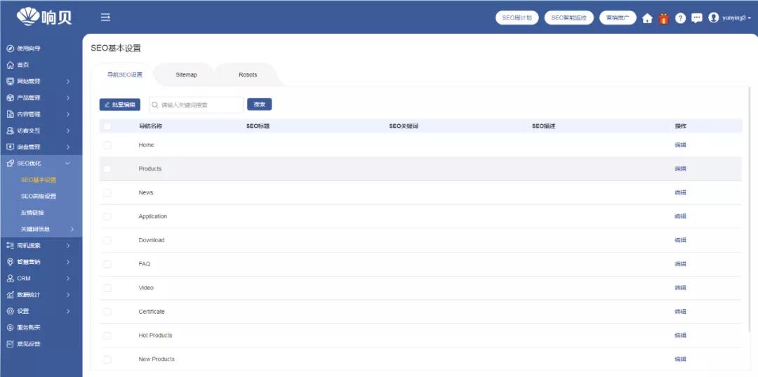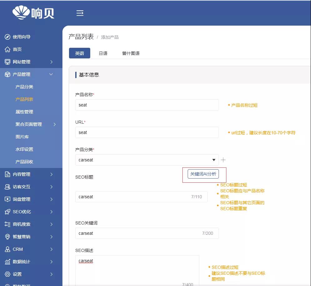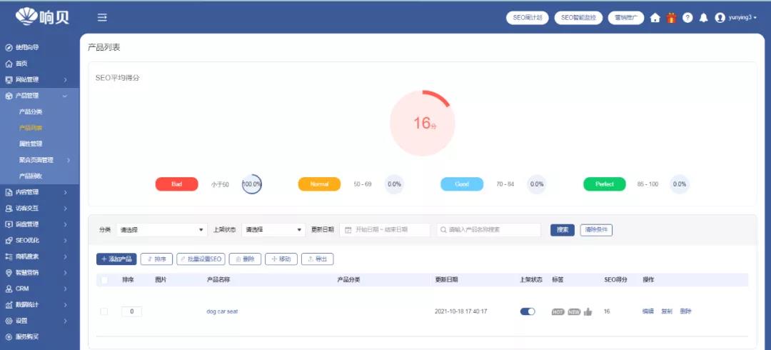 在響貝智慧營銷云站,產(chǎn)品列表首頁,還會對SEO進行評分。