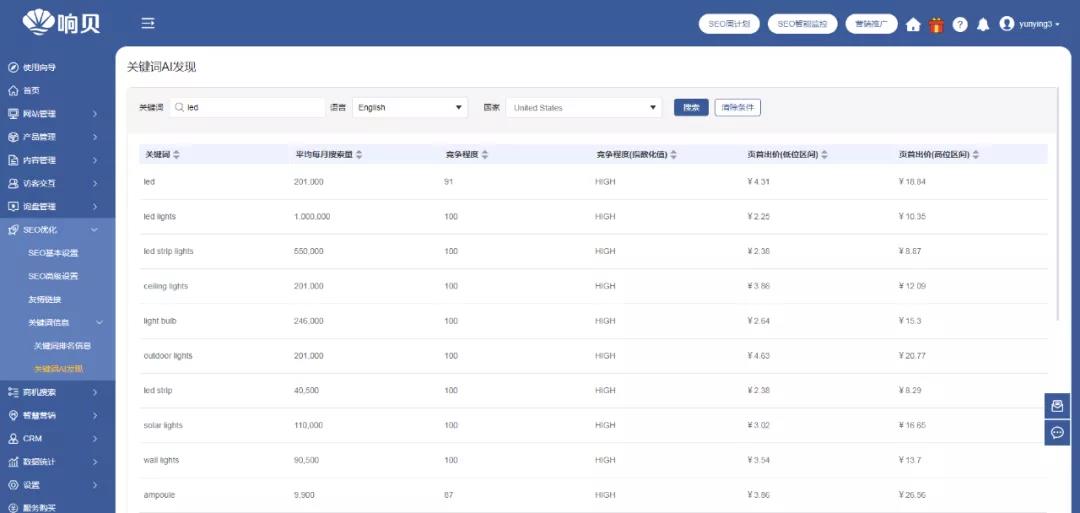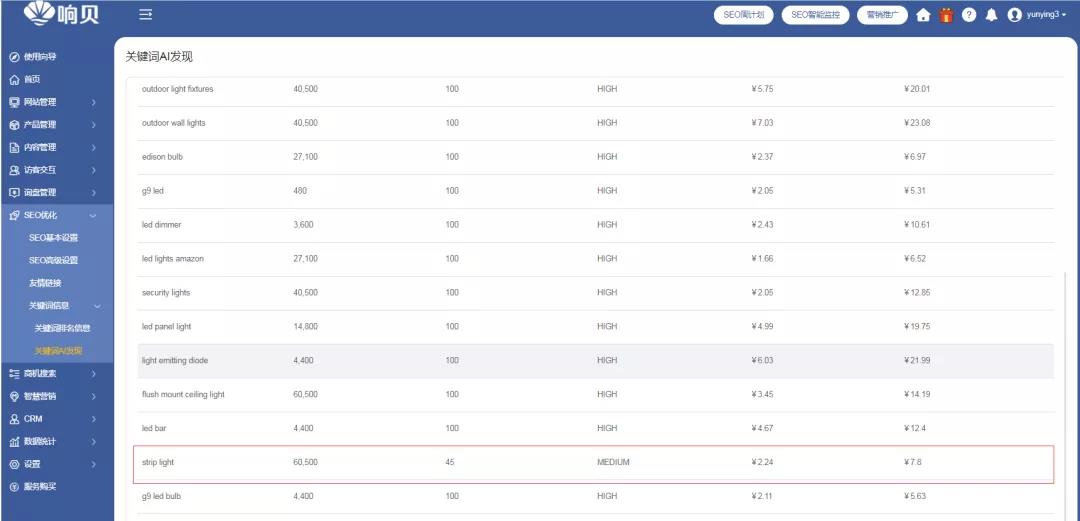 我們再來說說“技術(shù)手段”。 打開響貝智慧營銷云站,在后臺看到關(guān)鍵詞AI發(fā)現(xiàn)功能,這里就能夠幫我們“開腦洞”,找到更多有用的關(guān)鍵詞。